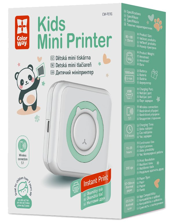 Kompaktní tiskárna ColorWay CW-P01G umožňuje dětem snadno vytvářet a tisknout vlastní kresby, samolepky a fotografie pomocí technologie termálního tisku bez potřeby inkoustu. Díky Bluetooth 5.1 se jednoduše připojí ke smartphonu nebo tabletu s operačním systémem iOS 8.0+ nebo Android 4.4+ a tisk probíhá během několika sekund.