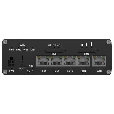 Router nabízí dvoupásmovou Wi-Fi 6 (802.11ax) s rychlostí až 2402 Mbps na 5 GHz a 576 Mbps na 2,4 GHz s podporou MU-MIMO pro současné připojení až 512 klientů. Konektivita zahrnuje 5× Gigabit Ethernet portů (1× WAN/LAN, 4× LAN), 2× SIM slot s automatickým přepínáním, podporu eSIM až pro 7 profilů a digitální vstupy/výstupy pro průmyslové aplikace. Operační systém RutOS (založený na OpenWrt) poskytuje pokročilé funkce včetně VPN, firewallu, MQTT, Modbus, BACnet, OPC UA a integrace s cloudovými platformami.