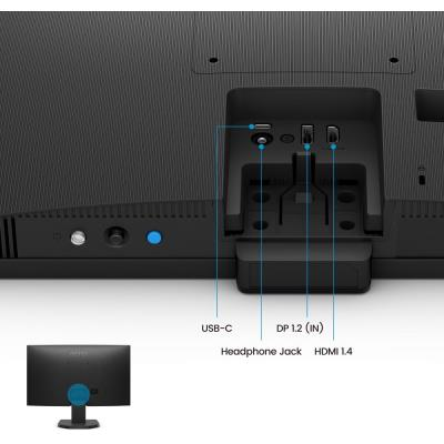 Monitor podporuje náklon od -5° do +20° pro optimální nastavení úhlu pohledu. Konektivita zahrnuje USB-C port s DisplayPort Alt Mode pro přenos dat, HDMI 1.4, DisplayPort 1.2 a výstup na sluchátka. Integrované stereo reproduktory 2 × 2 W poskytují základní audio výstup.